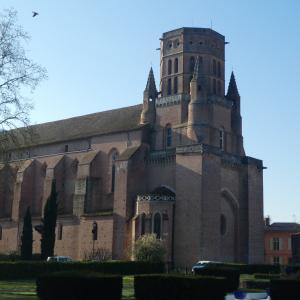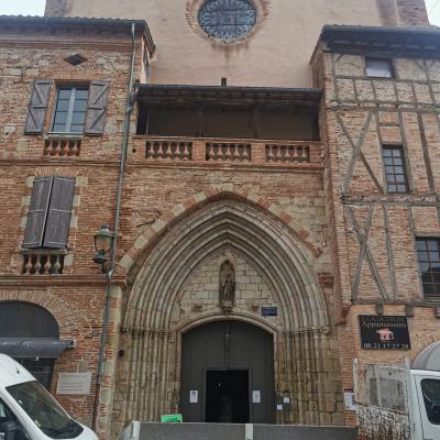 Ce bel édifice en brique de style gothique toulousain a été bâti en 1255. L'ouvrage qui surplombe l'Agout se caractérise par une nef unique bordée de chapelles, et à l'Ouest d'un puissant clocher-tour avec un portail monumental. Il abrite une table d’autel romane, et son buffet d'orgue en bois sculpté polychrome (1523) est un chef-d’œuvre de l'art de la Renaissance dans le Midi. Le Grand-orgue Cavaillé-Coll est installé en 1876.