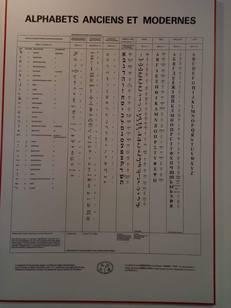 Un tableau nous a montré comment en partant de la forme initiale, par stylisation, nous aboutissons à l’écriture des lettres d’aujourd’hui.
