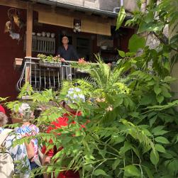 C’est du haut d’une terrasse que Jean-Yves Pagès, s’accompagnant de son tambourin, a proposé des histoires devant un public déjà enchanté par le lieu